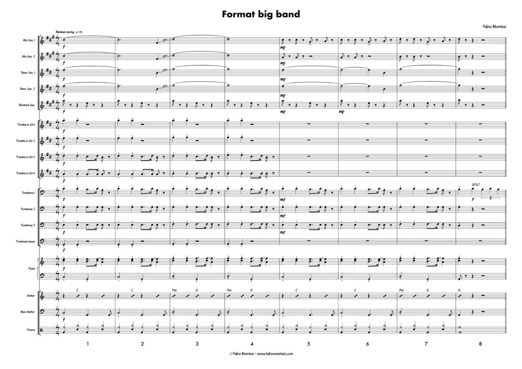 Tipica impaginazione per big band, con layout orizzontale, font jazzistico e numeri di battuta posti in basso. Utilizzabile con Dorico Pro e Dorico Elements