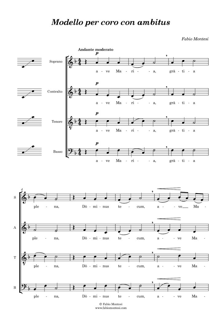 Coro SATB con ambitus prima del rigo per segnalare le estensioni delle voci. Utilizzabile con tutte le versioni di Dorico (SE, Elements e Pro)